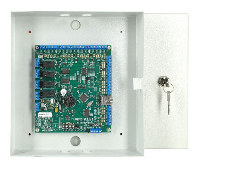 Управление четырьмя точками доступа: дверьми, турникетами, воротами в зависимости от настроек и наличии свободных клемм. Максимально до 7000 идентификаторов, 500 временных зон и 40000 событий в автономной энергонезависимой памяти. Интерфейс связи RS485.